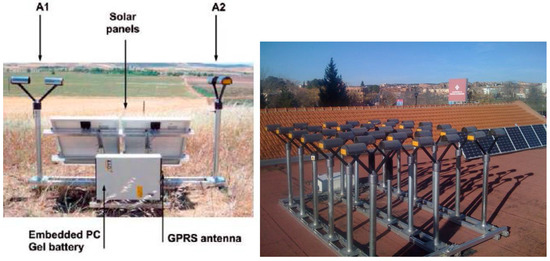 The University of Castilla-La Mancha (UCLM) has been maintaining a network of disdrometers since 2009. The original setup of the instruments consists of a dual arrangement with a solar panel and two batteries so the setup can work autonomously (Figure 1 Left). Data from the sensors were automatically sent to a server every minute and then filtered and processed to standard accumulation periods (1, 5, and 10 min). They have been compared and cross-calibrated (Figure 1 Right). Latest refinement and filtering of the database resulted in the empirical basis for this paper. For reference, the product of the whole process is tagged as the “UCLM disdrometer database v4.0.” This 2018 product supersedes previous versions of UCLM’s disdrometer data.