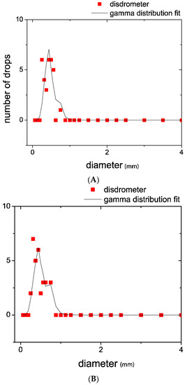 Measured RDSDs (A,B) used to build the two cases explored in this paper. Diameters are in mm. The fit is for a three-parameter gamma.