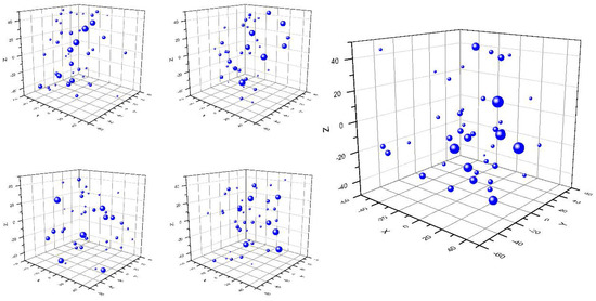 A sample of the different randomly-generated spatial distributions of raindrops consistent with one of the measured RDSDs of Figure 2. The diameters of the raindrops are exaggerated. Dimensions are in centimeters.