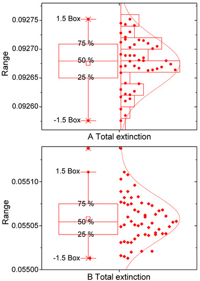 Figure 4, Figure 5, Figure 6 and Figure 7 gathers the results of calculations of basic radiometric quantities of interest calculated for the two cases in Figure 2. It is clear that the results are consistent and that the actual 3D distribution has an impact, as demonstrated by the existence of a distribution. In spite of the limited number of members in the ensembles, there is a clear shape around a central, more likely value. If there were no effect of different 3D arrangements in the scattering, no spread would appear. A purely random effect (“noise”) would generate a random distribution.