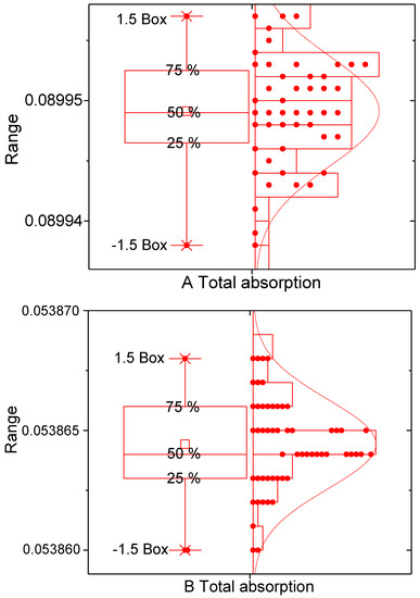 Variability of the total absorption for an ensemble of 50 3D configurations of the (A,B) RDSDs in Figure 2.