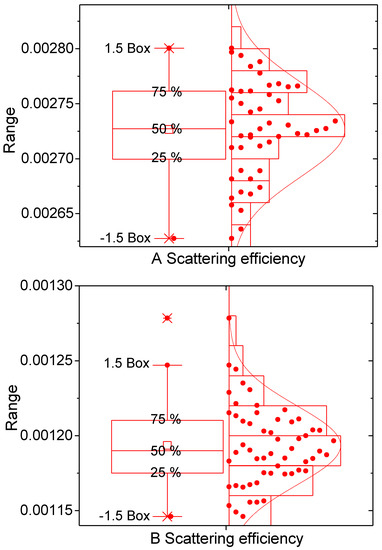 Variability of the scattering efficiency for an ensemble of 50 3D configurations of the (A,B) RDSDs in Figure 2.