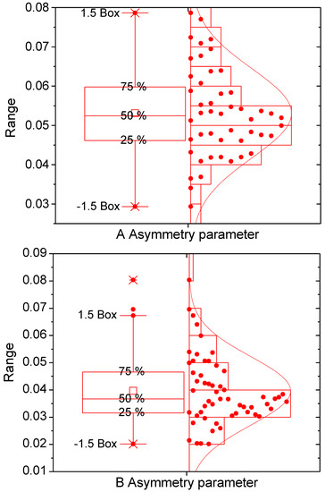 Variability of the asymmetry parameter for an ensemble of 50 3D configurations of the (A,B) RDSDs in Figure 2.