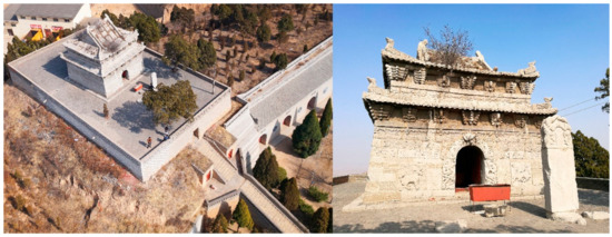 The Limestone Hall of XuanwuTemple (Figure 1) is located 10.5 km southwest from Heyang County, Shaanxi Province, China. It was established in a towering earth hummock. At the top of the earth hummock, a platform was built with green bricks, and the Limestone Hall is located in the central north of the platform (Figure 2). The bottom of the Hall is arranged with a stylobate with an east-west width of 9 m, south-north width of 9.25 m and height of 0.06 m. The plane of the hall is square with a side length of 8.01 m and height of 9.04 m. Nearly 700 lime stones were used to build the Hall, which is a wood-like structured double-eave irimoya. Exquisite relief patterns are sculptured in the stones of the outer wall of the Hall. An arch (Figure 3a) is set in the middle of the southern side of the Hall, and inside the arch is a barrel arch serving as the corridor to enter the Hall. The internal hall was built by a stone wall close to square in plane with an east-west width of 4.33 m and south-north depth of 4.38 m. A stone oblique beam was built in four corners of the internal wall in a position 1.89 m high away from ground (Figure 3b); multiple stone posts were used to overhang internally and converge in the center of the top of the hall generally and then became octagonal superimposed domes (Figure 3c). A statue of the Xuanwu Emperor is arranged in the temple.