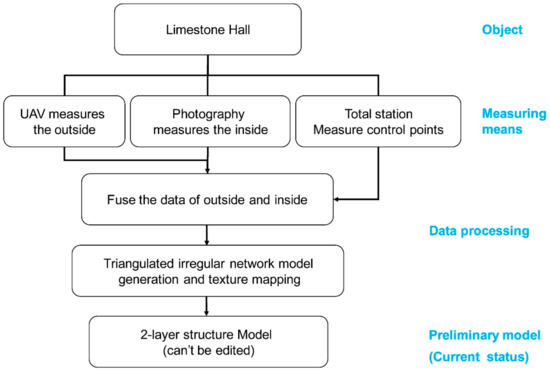 An unmanned aerial vehicle, digital single lens reflex, and total station were used to collect data in the stage of field operation. Smart3D software was used to generate a point cloud after processing the obtained internal and external data in the stage of internal operation. Cloud fusion was implemented according to data from the total station, and a triangular network model was generated. After texture mapping, a non-editable three-dimensional current status model was obtained (see Figure 6 for the operation steps).