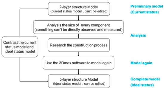 Although the as-built three-dimensional model is very vivid, it is actually made up of external and internal surface layers that cannot be disassembled and analyzed; therefore the calculation of mechanical simulation and anti-seismic performance cannot be carried out. Thus, it is subject to the current status model for reference, and a more intuitive, editable and separable model shall be established again. First of all, the current status model shall be provided with a size analysis, and the specific position for all structural layers of the building shall be specified. Binary opposition for all structural layers shall be specified and the set-up mode for the structure shall be speculated in reverse through the location information. A separable model can be established on this basis, and the specific procedures are shown in Figure 9.
