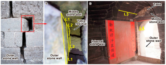 Third, the thickness of the interior high arch in the south side of the Limestone Hall (L3, showed in Figure 10c) is very close to the horizontal distance of the external surface of the wall under the second-floor eave in the Limestone Hall to the external wall. The thickness of the exterior low arch in the south side of the Limestone Hall (L4, showed in Figure 10c) is very close to the sum of L1 plus L2. In addition, the width of the L3 can be judged to be the total width of the inner wall, the tabia and the middle-layer wall according to the stone stacking mode of the inner side surface of the high arch.