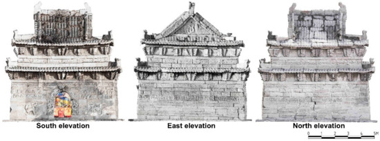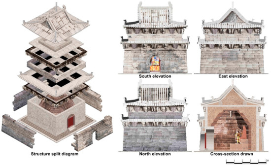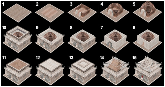The current status model in the .s3c format can be used to quickly browse and measure, but the current status model in the .obj format can be imported into 3Dmax software to be used for remodeling. In the 3Dmax software, the current status model is taken as the basic size for reference and the obtained position information and other size information can be analyzed combined with the structure. The ideal model (Figure 11) is separable and can be established according to the following procedure: (1) Lay the external platform through paving bricks; (2) Lay the internal platform through paving bricks; (3) Establish the internal wall of limestone; (4) Build rocky oblique beams at the four corners of the internal wall, and build an arch at the south side; (5) Utilize an oblique beam to corbel internally to form an octagonal dome; (6) Establish a center wall composed of limestone; (7) Build an arch at the south side of the center wall; (8) Establish an external limestone wall; (9) Fill with tabia between the external wall and the center wall; (10) Establish a 2-layer wall and a bucket arch; (11) Fill with tabia between the center wall and the dome roof; (12) Lay a limestone slate on the tabia soil layer of which the upper part shall be parallel and level with the top for the bucket arch layer; (13) Lay a stone ring beam in the center position of the limestone slate; (14) Vertical rammed section inside stone ring beam is the triangular tabia pile, and lay roof flagstones for Irimoya on mound; and (15) Install stones on the roof to be a ridge, install a wooden door under the lower part of the barrel arch, lay the statue of the Xuanwu Emperor indoors, and complete construction.