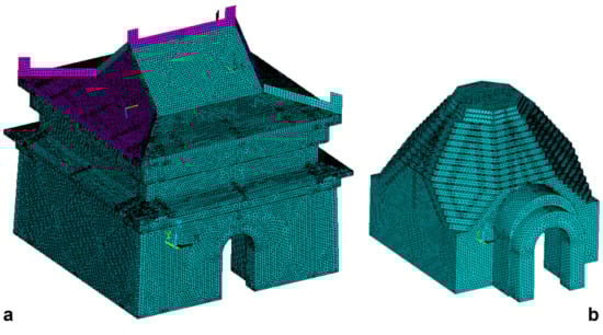 In order to guarantee effective calculation, the model should be properly simplified, and all members set as suitable structure units. The main structure of the Limestone Hall is divided into two types: one is a thin plate-like stone slab or a tabia layer, and the other is a square box-shaped solid rock or tabia. It is suitable to simulate the two by adopting the shell unit and the solid unit respectively. In addition, both units should be set as secondary units that can be finer than the primary unit when subjected to stress analysis. Among them, the top plate, ridge, and ring beam at the upper part of the second-floor were subjected to the shell unit (SHELL281) for modeling, and the internal wall, center wall, external wall and filled tabia were stimulated by the solid unit (SOLID186). Then, the Limestone Hall was covered in mesh. As the structure was too complex, the mesh quantity was properly reduced, and subjected to comprehensive meshing for division. The regular structure was subjected to a hexahedron for division, and the irregular structure subjected to a tetrahedron for division. There are relatively small members in the Limestone Hall, such as the height of per layer of the top of the corbelling dome is only 80 mm, which is the smallest size in a single member. When a larger-sized mesh is used for partitioning, it is impossible to accurately simulate it, and when an extra-small mesh is used, the calculation is too complex and thus unnecessary. So, the minimum size of the single member of 80 mm is used as the basis for dividing the structural mesh. The mesh size was set as 80 mm and was subject to a secondary-unit for division. The quantity for the generated quantity was 2,534,588 in total, and the node quantity was 867,374. The global mesh model was finally obtained and is shown in Figure 14. The units for the model calculation are: length in mm, pressure in MPa, force in N, quality t, and time in s. It should be noted that the non-linear analysis results in a more accurate calculation result, especially having certain advantages in describing the stress of the tabia. However, as the elastic modulus of the tabia is much lower than that of limestone, the effect of the tabia on the overall stiffness of the structure is negligible. The difference in data estimated using two analytical methods is very small. In addition, more relevant data need to be collected if using non-linear analysis, but we are prohibited from collecting stone pieces and necessary amount of tabia from the cultural relic body, so the performance of the material can only be tested by using the same kind of materials, and the data itself has certain error. If more parameters are added, more uncertainties will be actually added, affecting the accuracy of non-linear analysis results. Therefore, linear analysis is adopted for the simulation calculation.