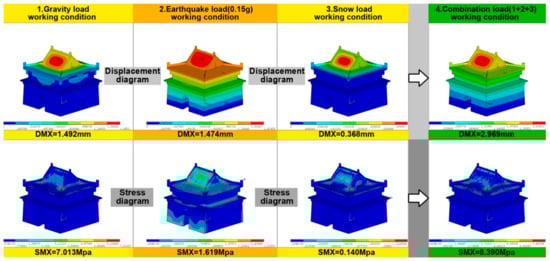 Displacement nephogram and stress nephogram of the Limestone Hall with an ideal status under three loads of gravity, earthquake, snow, and the combined load.