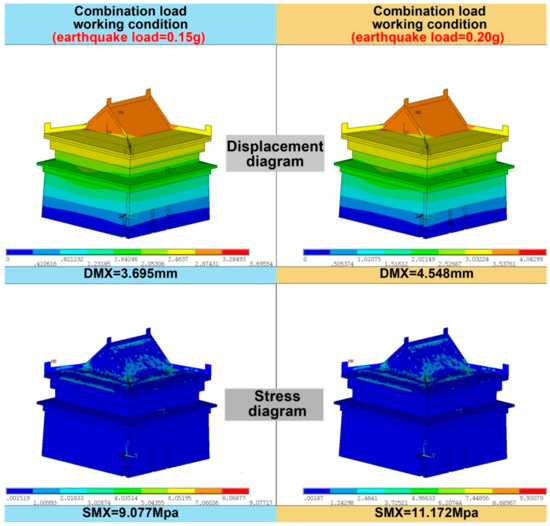 Displacement diagram and stress diagram of the Limestone Hall under ideal status with earthquake accelerations of 0.15 g and 0.2 g.