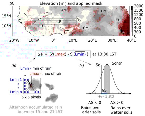 Study area and summary of the methodology. (a) Study domain in North Africa; the color-scale indicates elevation (m); black lines mark major rivers; and the orography mask is shown in red shading. The main orographic features in the region are the Air Mountains (AM), Darfur Mountains (DM), Ethiopian Highlands (EH), Cameroon Mountains (CM), Jos Plateau (JP) and Guinea Highlands (GH). The five smaller domains marked with black rectangles indicate the areas selected for the analyses of atmospheric conditions over the relatively flat West African region. (b) Schematic representation of afternoon rainfall event geometry. (c) Generalized example illustrating the calculation of the deviation, , of the observed spatial soil moisture gradient, , from the expected value of climatological soil moisture gradients, , for an individual rainfall event.