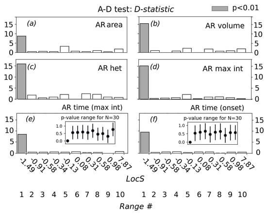 Sensitivity of afternoon rain properties to preceding soil moisture heterogeneity conditions. D-statistic of the Anderson–Darling (A–D) test, i.e., weighted average squared difference between the two selected Empirical Distribution Functions (EDF), for every range (x-axis) and six rain properties: (a) rain area, (b) volume, (c) spatial heterogeneity, (d) maximum intensity, (e) time of maximum intensity and (f) onset time. The first EDF results from the sample of the specific AR property in the particular range, while the second EDF results from the total sample of that AR property independent of the range. Differences significant at the 99% level (p-value < 0.01) are shaded in gray. In the case of the two discrete AR time parameters (e,f), the calculation of the A–D statistic for every range was repeated 100 times for every 30 randomly-selected event values. The two inset plots in (e) and (f) show the spread of the estimated p-values for every sample and every range. The number of events in every range is the same, i.e., ∼1500, because they are binned per decile. The same qualitative result was obtained for the two discrete distributions using the Chi-squared non-parametric test for a complete 1500 sample size (not shown).