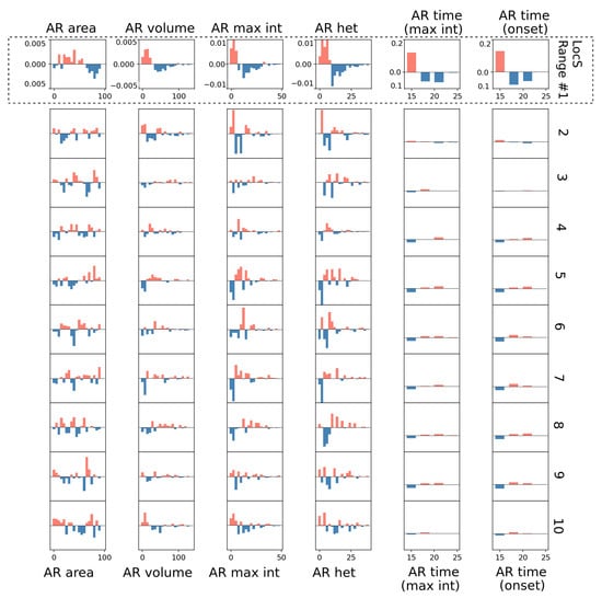 To explore the relationship between rain properties and preceding soil moisture state, we first address the question: ‘Which rain conditions are more likely to occur given the antecedent soil moisture heterogeneity?’. To do so, the results in Figure 2 are further scrutinized by analyzing the correspondent Difference Histograms (HD) for each AR property at every range. Results in Figure 3 (first row) indicate that the probability distribution of each AR property within the Range #1 reveals a clear and systematic shift from its expected (total) distribution. This shift points to a higher probability to observe an AR system with smaller area and volume, weaker maximum intensity and lower spatial variability, if the rain system developed over a strong negative soil moisture gradient. The most pronounced differences are observed in the timing of the events. Figure 3 (Columns 5–6) indicates a strong preference for rainfall to onset earlier (at 15 LST), as well as to show earlier maximum intensity when the soil moisture gradients are strong and negative (i.e., Range #1). Consistently with the A-D test results, any other differences in probability frequencies (of any AR property for any other heterogeneity range) are negligible and non-significant.