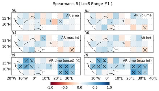 Spatial distribution of the correlations between the rain properties and soil moisture heterogeneity. Spearman’s rank correlation coefficient between the soil moisture gradient, , and corresponding AR property value is estimated for each 5 × 5 degree grid box. Only the extreme negative values (Range #1) are considered. Boxes with significant correlation (p-value < 0.05) are marked with a cross. Grid boxes where the number of events is below 20 are masked out.