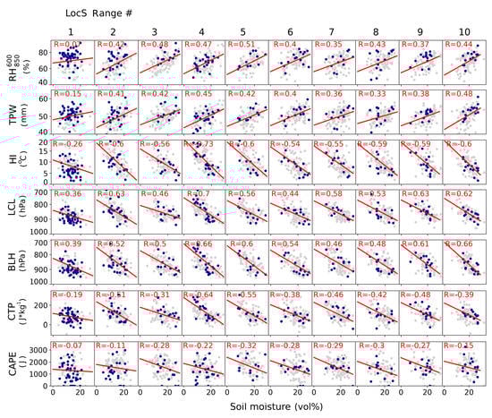First, we assess the co-variation of a corresponding boundary layer parameter at 12 LST with the value of soil moisture in the afternoon overpass of AMSR-E (13:30 LST) over the location; this is done for all AR events that fall within each heterogeneity range. The scatter plots obtained for one domain (11–12N, 8W–12E) are shown in Figure 5 and are separated by the AR events with the earliest onset time (at 15 LST, blue-colored dots) and later onset times (gray-colored dots). The main feature of the identified co-variability between the boundary layer parameters and soil moisture is the presence of a relatively strong (non-)linear relationship for the heterogeneity Ranges #2–10 and the absence of such a relationship for the extreme negative Range #1. This can be seen in the observed range of Spearman’s rank correlation coefficients estimated for every plot (red text and regression line; see Figure 5). The reason for this difference is a unique combination of the driest soil conditions and the wettest boundary layers where the majority of the AR events with the earliest onset time occur in the Range #1 (Figure 5, left column). The clearest evidence of this relationship is found in all moisture-related parameters, independent of the height of the considered atmospheric layer. These are mean Relative Humidity between 850 and 600 hPa (RH), Total column Precipitable Water (TPW) and the Humidity Index (HI). Consistent with the higher moisture amount, lower pressure levels of Lifting Condensation Level (LCL) and Boundary Layer Height (BLH) are observed on days with the early AR onset. On the contrary, the two instability measures, expressed by Convective Triggering Potential (CTP) and Convective Available Potential Energy (CAPE) do not show any notable distinctions between the days with the earlier and later AR onset.