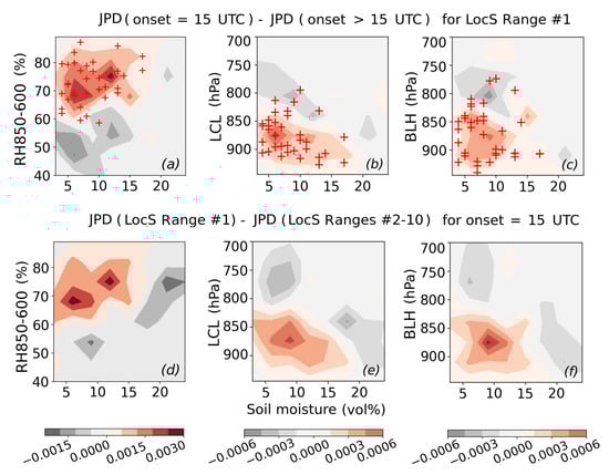 Preference of early onset AR events to occur over particular antecedent soil moisture and boundary layer conditions. (a–c) Difference in the Joint Probability Distribution (JPD) of absolute soil moisture (at 13:30 LST) and each boundary layer variable (at 12 LST) between AR events with an earlier onset time (i.e., 15 LST) and a later onset time (i.e., 18–24 LST). The plots refer to the events occurring over extreme heterogeneous and dry soils ( Range #1) only. Accordingly, red shading indicates a higher probability of early onset AR events to occur over dry soil and moist boundary layer conditions as compared to AR events with later onset time (and vice versa for gray shading). (d–f) Difference in the JPD of absolute soil moisture (at 13:30 LST) and each boundary layer variable (at 12 LST) between early AR events that fall over extremely heterogeneous landscapes (Range #1) and those that fall in less heterogeneous states (Ranges #2–10). Accordingly, red shading indicates a higher probability of early onset AR events from the Range #1 to occur over dry soil and moist boundary layer conditions as compared to early onset AR events from Ranges # 2–10. All plots show the mean relationship over the five small domains illustrated in Figure 1a. Red crosses place the lowest 10th percentile (i.e., the strongest) negative soil moisture gradients from all five domains in the corresponding parameter space. The selected boundary layer parameters from left to right are: Relative Humidity (RH, %) (averaged between 850 and 600 hPa), Lifting Condensation Level (LCL, hPa) and Boundary Layer Height (BLH, hPa).