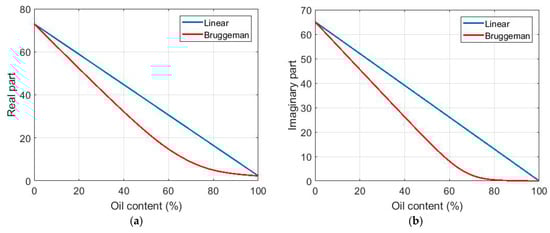 Effective dielectric constant of an oil-in-water emulsion plotted by increasing oil content using a linear model (blue) and the Bruggeman’s model (red): (a) real part; (b) imaginary part.