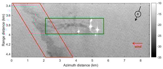SETHI L-band SAR data, VV-polarization, 13:30 UTC. Red box: MOS Sweeper spill. Green box: DESMI Boom spill—multi-look 21 × 21.