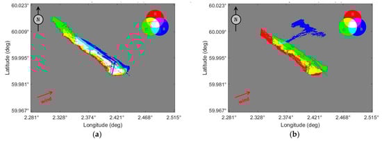 The four SAR scenes investigated in this paper have been projected from the slant range to the ground range geometry (Figure 6). The spilled area has been automatically detected using the polarization difference (in linear unit) between VV and HH channels [,,,] and the temporal evolution of the detected area is pictured on Figure 7 in a false color representation: drifting of the MOS Sweeper spill for one hour (from 09:37 to 10:27 UTC) in the morning of 9 June (Figure 7a) and drifting of the spill for four hours (from 09:37 to 13:30 UTC), Figure 7b. The spilled product during the MOS Sweeper exercise has drifted in the North-East direction, under the influence of wind (coming from 250°, cf. Table 2). The distance traveled by the spill between the first (09:37) and the last acquisition (13:30) is about 1.8 km in 4 h, which corresponds to a drift speed of about 0.125 m·s−1.