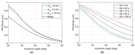 Bragg theory and U-WCA scattering model. Polarization Ratio (PR) as a function of the incidence angle (a) for various wind speeds and (b) for various oil contents using the Bruggeman formula to estimate the effective dielectric constant of an oil-in-water mixing with a wind speed of 5 m/s. Values of the dielectric constant are taken from Table 1.