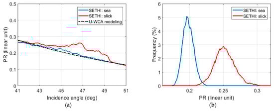 PR at L-band (a) estimated with the U-WCA scattering model (dotted black) and measured with experimental SAR data (SETHI NOFO’2015 10:02 UTC) across a range transect over a clean sea surface (blue) and a slick-covered surface (red); (b) Normalized histograms of experimental PR values measured at L-band (SETHI NOFO’2015 10:02 UTC) over clean sea (blue) and slick (red) surface with an incidence angle of 46°.