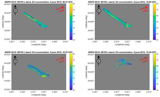 Since the remote sensing dataset explored in this study was not collected with validation data, no comparison between oil concentration estimate and in situ sampling within the spill areas can be performed. Even if the method reported in this paper is based on physical justifications, it cannot be formally validated. However, all the results presented herein are consistent with the expected behavior of an oil slick imaged area. First, the values of the oil concentration estimate are close to the concentration usually observed []. Then, we observe no trend of the estimation in the range direction, which suggests that the incidence angle variation across the swath as well been considered. Moreover, SAR data collected with a small time gap (09:37, 10:02 and 10:27 UTC) give similar oil content maps, despite the polluted area is differently positioned in the swath between the images, which ensures the robustness of the proposed methodology. Finally, the estimated maps covering the evolving spill over a 4-h period indicates a decrease of the average oil concentration, which can be attributed to weathering processes.