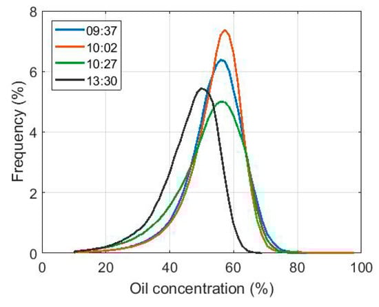 Normalized histograms of oil concentration estimated within the mineral oil slick released during the MOS Sweeper exercise. Temporal measurements at 09:37 (blue), 10:02 (red), 10:27 (green) and 13:30 UTC (black).