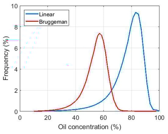 The quantification method proposed in this paper is based on the U-WCA scattering model and the Bruggeman formula for estimating the oil concentration from the effective dielectric constant of the oil-in-water mixture. Usually, a simple linear mixing between mineral oil and seawater is employed [,]. This important simplification leads to a significant error in the estimate of the oil concentration within an oil slick. The Figure 14 below shows two histograms of the oil concentration (run 2—10:02 UTC) obtained using a linear (blue curve) and the Bruggeman model (red curve). With a linear mixing, the histogram is shifted to the higher values of oil concentration, resulting in a strong overestimation of the average oil concentration (75% against 52%). These results show that the selection of the dielectric mixing model is a key aspect. The Bruggeman model has proven [] to accurately reproduce the effective dielectric constant of an emulsion-type mixture and is highly recommended against the linear one when investigating the surface properties of marine slick from SAR imagery.