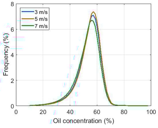 The second source of errors comes from the wind information which is one of the inputs of the U-WCA scattering model. This information usually comes from large-scale forecast models, which cannot describe local variations. According to the Norwegian Meteorological Institute, the wind speed (U10) was 5 m/s during SAR data acquisition at 10:02 UTC (run 2). The oil concentration has been estimated in a wind speed interval of +/− 2 m/s around the reported value. Histograms of oil concentration estimated from dual-pol SAR data collected at 10:02 UTC and for an input wind speed of 3, 5 and 7 m/s are shown in Figure 15. As discussed in Paragraph 4.1, at low EM frequency the polarization ratio has a weak dependence on surface roughness and therefore modelling with the U-WCA scattering model varies only slightly with wind speed. Hence, wind speed uncertainties induce little errors on the estimate of the oil content into the oil-in-water mixing. For the investigated SAR data collected at 10:02 UTC, the mean oil concentration is estimated to be 51.9%, 52.4% and 50.8% for a wind speed of 3, 5 and 7 m/s, respectively.