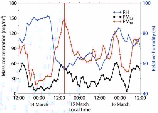 On 14 March 2009, a heavy dust storm affected vast regions of East Asia. The ground-based measurements indicated that the value of PM10 exceeded 500 μg/m3 in Inner Mongolia, Beijing, and other cities in North China [10]. The radiative effect caused by the dust aerosols was studied for this event [45]. At the PR lidar site, PM10 mass concentration and RH were observed near the surface to determine the effect of the dust event. The PM10 value reached a peak of approximately 150 μg/m3 in Chungli City at 16:00 LST, as shown in Figure 1. In addition, the RH significantly decreased as the PM10 increased.