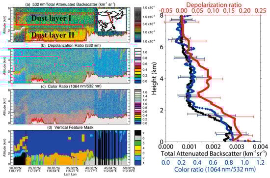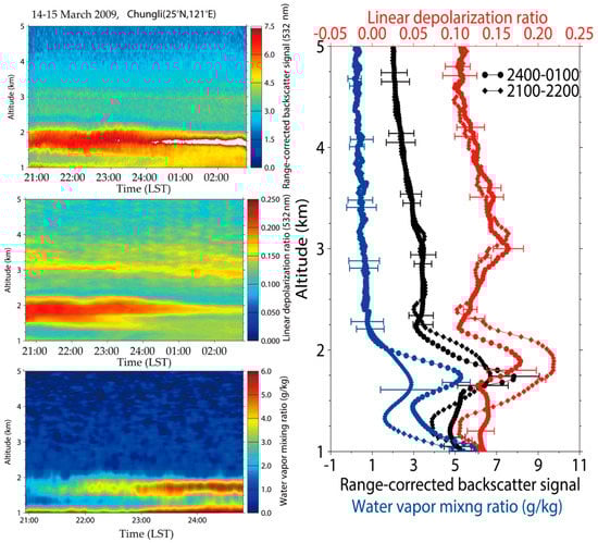 Left panel: vertical structure of the dust aerosols and clouds observed by ground-based PR lidar in Chungli, Taiwan beginning at 20:45 LST on 14 March 2009; Right panel: mean profiles of range-corrected lidar backscatter signal (black), linear depolarization ratio (red) and water vapor mixing ratio (blue) from the PR lidar observation. Errors are estimated based on Chiang et al. [47].