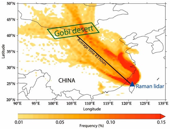 To locate the source region and the transport path of the dust aerosols, 48 h backward trajectories using the NOAA HYSPLIT model were analyzed for the duration of the dust episode with the PR lidar site selected as the starting point. We calculated approximately 500 single backward trajectories over the altitude range of 100 to 3500 m for the period from 12:00 to 24:00 LST on 14 March 2009. The time interval and altitude resolution of the backward trajectories were 1 h and 100 m, respectively. Subsequently, the PDF of all of the trajectories at each 0.5° × 0.5° grid was calculated. Figure 3 shows that most of the backward trajectories were traced to the Gobi Desert, which is the second largest dust source in East Asia. Therefore, the dust aerosols were long-range transported from the Gobi Desert to Taiwan Island across Southeast China. CALIPSO measurements confirm the trajectory analysis that the dust event affected vast regions of China, as shown in Figure 4. According to the HYSPLIT backward trajectory analysis, the average travel time of the air masses from the Gobi Desert to the PR lidar site was approximately 43 h over a distance of ~2000 km.