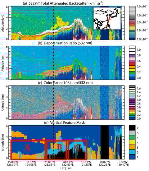 - Huang, J.; Minnis, P.; Chen, B.; Huang, Z.; Liu, Z.; Zhao, Q.; Yi, Y.; Ayers, J.K. Long-range transport and vertical structure of Asian dust from CALIPSO and surface measurements during PACDEX. J. Geophys. Res. Atmos. 2008, 113. [Google Scholar] [CrossRef]