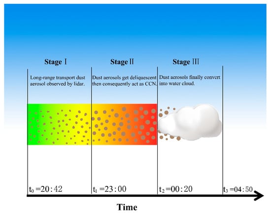 Schematic illustration of three stages of heterogeneous process, during which long-range transported dust aerosols are converted into water cloud under moist conditions in the atmosphere. Brown dots represent dust aerosols. The x-axis shows the evolution of the process estimated mainly from lidar measurements. Shadings show gradual change of water vapor at the altitude of the dust layer, and green and red colors represent low and high values of water vapor content, respectively.