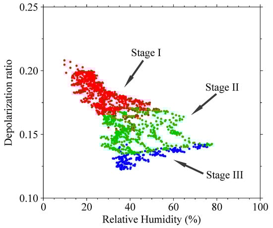 Scatter plot of the DR and RH estimated from combined Raman lidar data and radiosonde temperature at nearby sounding station, between 1.5 and 1.7 km above the ground. The red, green, and blue dots represent different observation periods, corresponding to Stage I, Stage II, and Stage III, as shown in Figure 6, respectively.