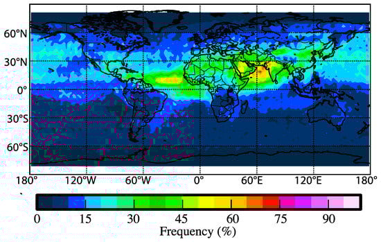 Collocated CALIPSO and CloudSat measurements were used to investigate the global distribution of dusty clouds between 2007 and 2010 in spring, as shown in Figure 8. Dusty clouds could be identified with clouds existing in a dust plume environment, while pure clouds are those in dust-free conditions, using the method as proposed by Wang et al. [56] and Jin et al. [57]. Here, we define dusty clouds as clouds observed within 50 m of the dust aerosols. Firstly, dust aerosol or cloud layer could be identified from CALIPSO lidar level 2 data product. Then the cloud mask data from CloudSat 2B-GEOPROF is used to confirm the presence of clouds and provide confidence of dusty cloud. The results show that two main high dusty clouds over the world are located at south Asia and west of Africa, up to more than 60%, and approximately one-third of clouds are dusty in the spring over the Pacific Ocean. Furthermore, cloud fraction of dusty cloud at low latitudes over the Ocean is about 20% in spring across east Asia to North America. Therefore, dust aerosol may have significant impact on cloud properties in the atmosphere.