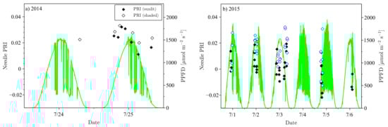Needle PRI measurements (symbols, left axes) and top-of-canopy PPFD (right axes) during the two measurement campaigns in (a) 2014 and (b) 2015. On the horizontal axes, date numbers are located at the local solar noon.