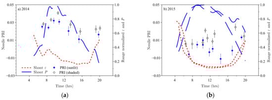Diurnal variation in shaded (empty symbols) and sunlit (filled symbols) needle PRI (pooled data, left axes); and the photosynthetic assimilation (dashed line) and the light use efficiency of sunlit shoots (dotted line, right axes). and are normalized by their maximum daily values; (a) 2014; and (b) 2015. Error bars indicate 90% confidence limit for mean needle PRI.