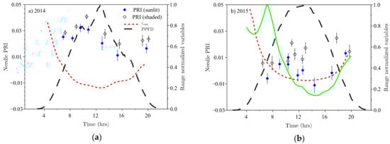 Diurnal variation in needle PRI (symbols, left axes) together with top-of canopy PPFD (dashed line) and the range-normalized canopy light use efficiency (dotted line, right axes): (a) 2014; and (b) 2015. For 2015 (b), canopy PRI data were also available (solid green line).