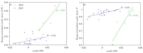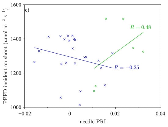 We found no systematic correlations between sunlit needle PRI and sunlit shoot photosynthesis on the daily scale (data not shown). However, when including only mid-day measurements using the threshold , we found significant correlations between sunlit needle PRI and the shoot LUE, (p = 0.006 and p = 0.047 for 2014 and 2015, respectively, Figure 5a); in 2014, when the data were obtained within 24 h, . Using the same PPFD threshold, we found stronger correlations between sunlit needle PRI and the shoot photosynthetic assimilation (p = 0.008 and p = 0.001 for 2014 and 2015, respectively, Figure 5b). We found no statistically significant correlation between needle PRI and shoot PPFD, Figure 5c): the regressions had different slopes and were statistically insignificant (p > 0.25).