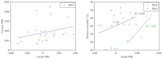 At the canopy level (i.e., SMEAR II data), sunlit needle PRI and photosynthesis data were not correlated (data not shown) regardless of light level. However, at high light levels (), canopy and sunlit needle PRI were correlated (Figure 6a), although the correlation was not significant (). We also found systematic correlations (the same direction for all campaigns) between needle PRI and ambient air relative humidity (Figure 6b), although the correlations were not always significant (p = 0.02 and p = 0.12 for 2014 and 2015, respectively).