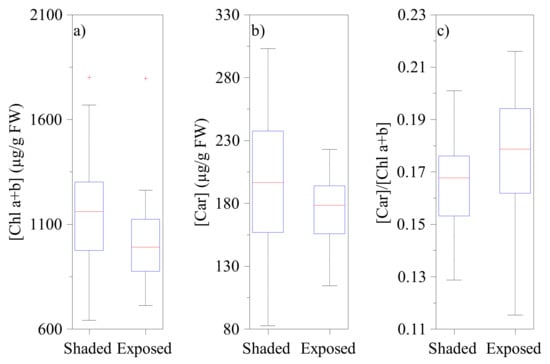 According to laboratory measurements, the ratio of carotenoid to chlorophyll content was somewhat larger for the sunlit than for the shaded shoots (Figure 7), but the difference was small (relative difference in [Car]/[Chl] ratio: 15%) and not highly significant ().