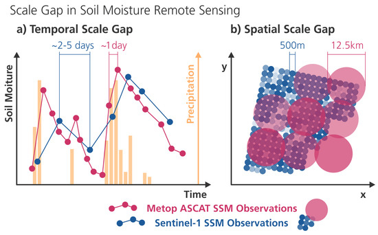 However, for a single remote sensing system, there always exists a trade-off between spatial and temporal resolution of the observations, leading to missed dynamics either in the spatial or temporal domain. We exemplify the scale gap in remote sensing with the illustration in Figure 1, sketching the characteristics of the SSM products from Metop ASCAT [22] and Sentinel-1 [31]. While the SAR product does not measure often enough to fully capture the SM variations induced by rainfall, the ASCAT product has a much coarser resolution.