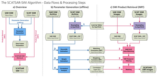 (a) overview on the SCATSAR-SWI retrieval algorithm and its data flows, with the offline parameter generation in blue and the near-real-time (NRT) product retrieval in red; (b) the parameter generation preparing the data fusion parameters (Matching Parameters, Weighting Functions and Correlation Layer) for the product retrieval, using surface soil moisture (SSM) and surface state flag (SSF) from the input datasets; (c) the NRT-capable SWI product retrieval, taking up incoming SSM data as well as prepared data fusion parameters.