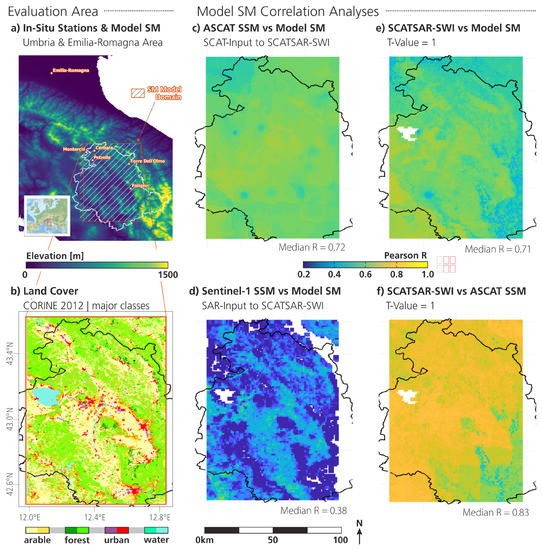 (a) evaluation area over Umbria, with Model SM domain, in situ stations, and COSMOS-station in Emilia Romagna. Elevation map as background; (b) CORINE Land Cover, grouped as main classes occurring in the Umbria area. Results as discussed in Section 5.2: (c,d) comparison of the input SSM datasets with Model SM, showing the Pearson R over the model domain; (e) comparison of the SCATSAR-SWI with Model SM; and with ASCAT SSM (f).