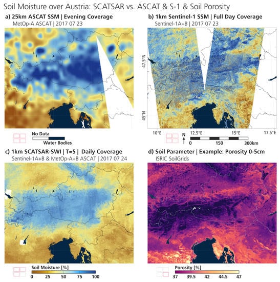 - Bauer-Marschallinger, B.; Naeimi, V.; Cao, S.; Paulik, C.; Schaufler, S.; Stachl, T.; Modanesi, S.; Ciabatta, L.; Brocca, L.; Wagner, W. Towards Global Soil Moisture Monitoring with Sentinel-1: Harnessing Assets and Overcoming Obstacles. IEEE Trans. Geosci. Remote Sens. in review.