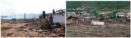 On 30 August 2016, the area experienced torrential rains brought by Typhoon Lionrock, which overflowed the Tumen River and brought huge amounts of water into the plains at least once. Consequently, North Korean state media distributed photographs of damage related to our study area. As previously mentioned, the media described the flood as the biggest national disaster since 1945, and casualties reached several hundred, including those dead and missing. Some 68,900 people had lost their homes, and there were also reports that “about 11,600 houses were destroyed, and that some 29,800 other houses suffered huge damage” [2]. Figure 2 shows images of the flood damage in Hoeryeong City.