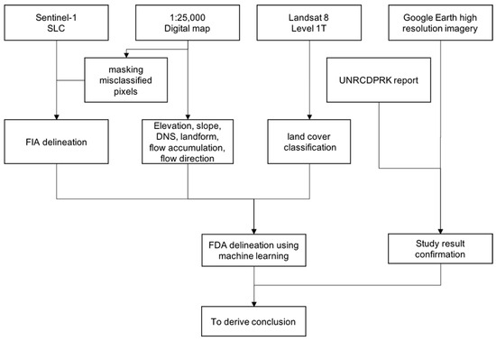 Although radar RS data provides the benefits of data collection regardless of weather conditions, it is limited insofar as radar only recognizes a distributed target [10]. Thus, it is necessary to complement this data with water flow simulations using a Geographic Information System (GIS) to delineate the FDAs more accurately. Prior studies have used RS data and GIS integration models to detect and predict FDAs [8,10,11,12,14,18]. These models can be used in areas without field hydrologic data [14]. Therefore, they can be applied to study FDAs in otherwise-inaccessible areas of NK.