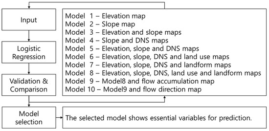 Lastly, an FDA delineation model was developed using an LR model. Ten models were tested to select the best model for FDA delineation. Model 1 used only an elevation map for modeling. Model 2 used a slope map, model 3 used elevation and slope maps, and model 4 used slope and DNS maps. Model 5 used elevation, slope and DNS maps, model 6 used elevation, slope, DNS and land use maps, and model 7 used elevation, slope, DNS and landform maps. Model 8 used elevation, slope, DNS, land use and landform maps, model 9 used elevation, slope, DNS, land use, landform and flow accumulation maps, and model 10 used elevation, slope, DNS, land use, landform, flow accumulation and flow direction maps (Figure 5). The R software was used to delineate FDAs.